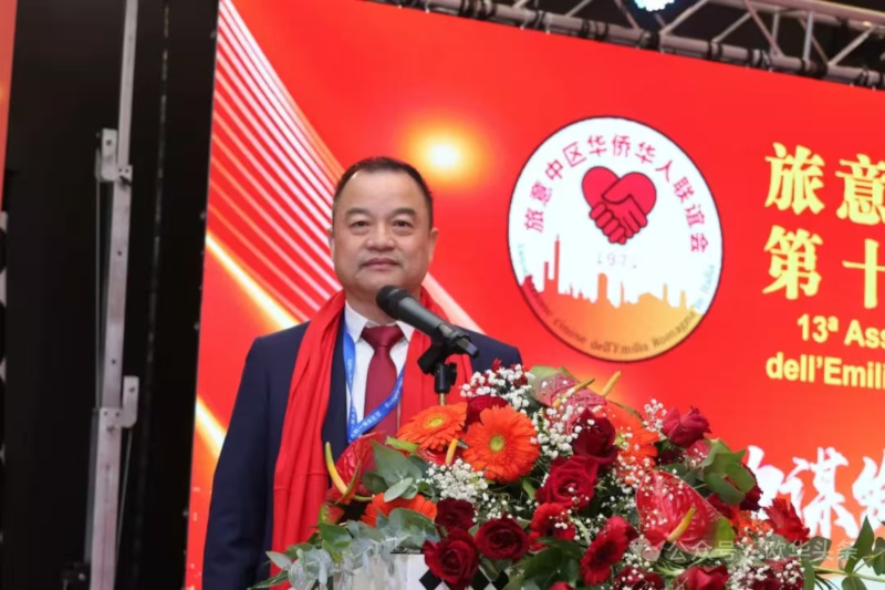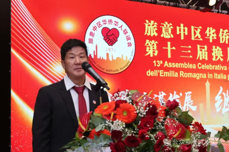 新一任会长蔡焕忠发表就职讲话。蔡焕忠会长代表旅意中区华侨华人联谊会第十三届理事会,向长期以来关心和支持本会的中国驻米兰总领馆、博洛尼亚市政府、各兄弟侨团及社会各界人士表示衷心的感谢,并对莅临现场的嘉宾表示热烈欢迎。蔡焕忠会长回顾了旅意中区华侨华人联谊会的发展历程。他指出,联谊会在历届理事会的不懈努力下不断发展壮大,在服务侨胞、维护侨益、联系当地政府、支持总领馆工作以及配合国内涉侨部门开展慰侨活动等方面,都发挥了重要作用。多年来,联谊会积极为国内政府部门与意大利各机构间的交流合作搭建桥梁,赢得了中国驻米兰总领馆和国内有关部门的充分肯定与赞赏,社会影响力不断提升。对此,他代表第十三届理事会,向历届会长及会长团成员致以最诚挚的谢意。他表示,能够当选为第十三届会长,倍感荣幸,也深感责任重大。他感谢全体理事会成员的信任与支持,并表示新一届理事会将继续秉承“团结、服务、发展”的创会宗旨,进一步加强侨社建设,在服务侨胞、维护侨益、促进中意文化与经贸交流等领域作出更大贡献。他特别提到,本届理事会新增设了妇女委员会和青年委员会,旨在吸纳更多妇女精英和青年才俊加入侨团,发挥妇女的巾帼力量与青年一代的创新优势,积极融入当地社会,传播中华文化,讲好中国故事,进一步凝聚侨心侨力。
