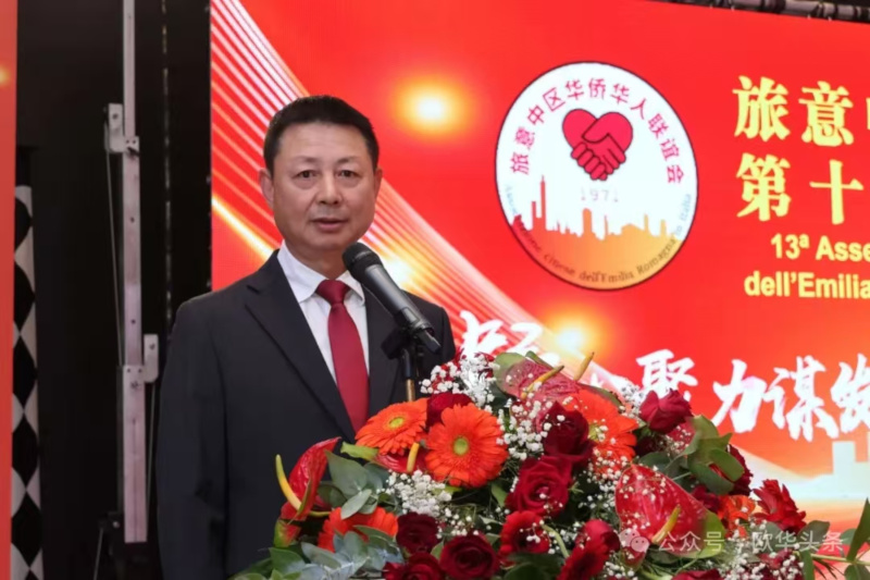 中国驻米兰总领事刘侃发表讲话。刘侃总领事代表中国驻米兰总领馆,对蔡焕忠先生当选新一届会长表示热烈祝贺,并向郑仕胜前会长及全体会员多年来为侨社建设和中意友好作出的贡献致以诚挚感谢。他指出,旅意中区华侨华人联谊会是意大利侨界历史悠久、影响广泛的重要侨团。长期以来,联谊会坚持“立会为公、办会为侨”,在服务侨胞、维护侨益、推动中意交流方面成果显著。特别是在疫情期间,联谊会组织防疫物资、关爱困难侨胞,展现出浓厚的家国情怀和强烈的责任担当,也赢得了侨界与当地社会的广泛认可。刘侃总领事希望,新一届理事会在蔡焕忠会长带领下,继续发扬优良传统,凝聚侨心侨力,提升组织力与影响力,把联谊会建设成为侨胞信赖、充满温情的“温暖之家”,为构建和谐侨社、促进中意民间交流作出新贡献。同时,他勉励广大侨胞讲好中国故事,展现新时代旅意华侨华人的良好形象。他指出,今年是中意建交55周年,两国关系正处在承前启后、继往开来的重要阶段。展望未来,中意双方将继续深化务实合作,共同为世界和平与稳定贡献力量。中国驻米兰总领馆将秉持“外交为民”宗旨,持续优化为侨服务,与侨界携手推动中意关系行稳致远、再创辉煌。