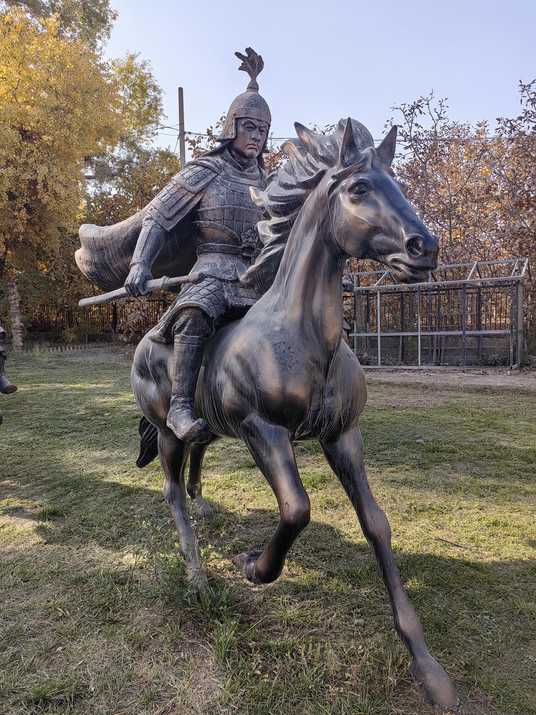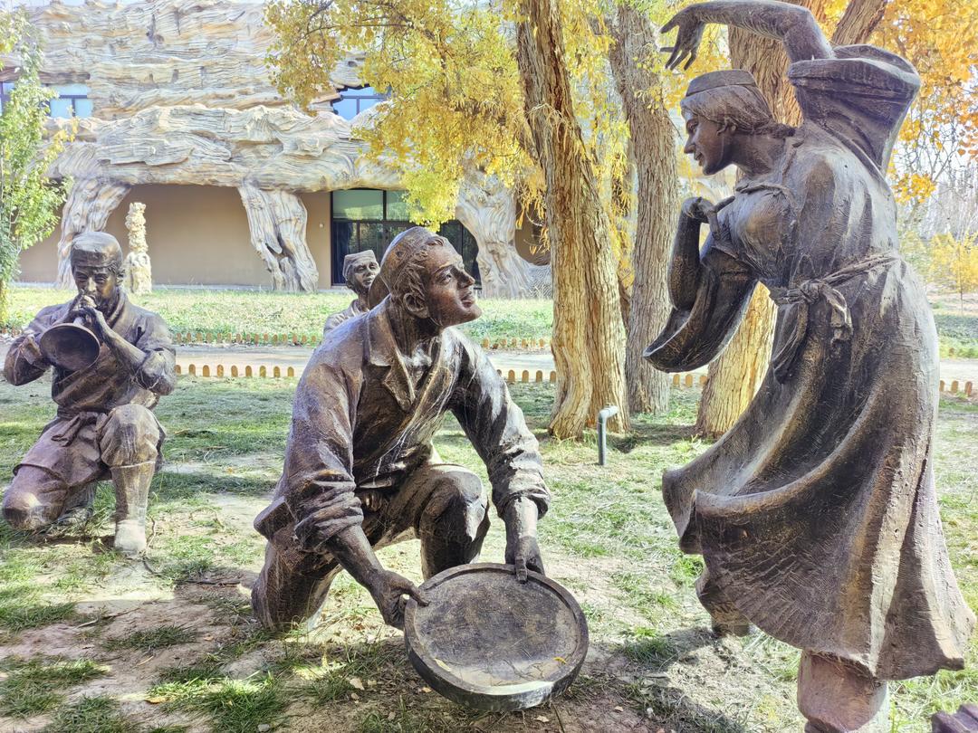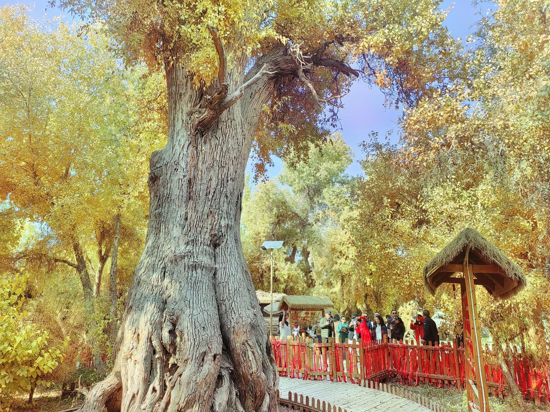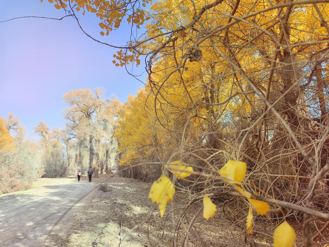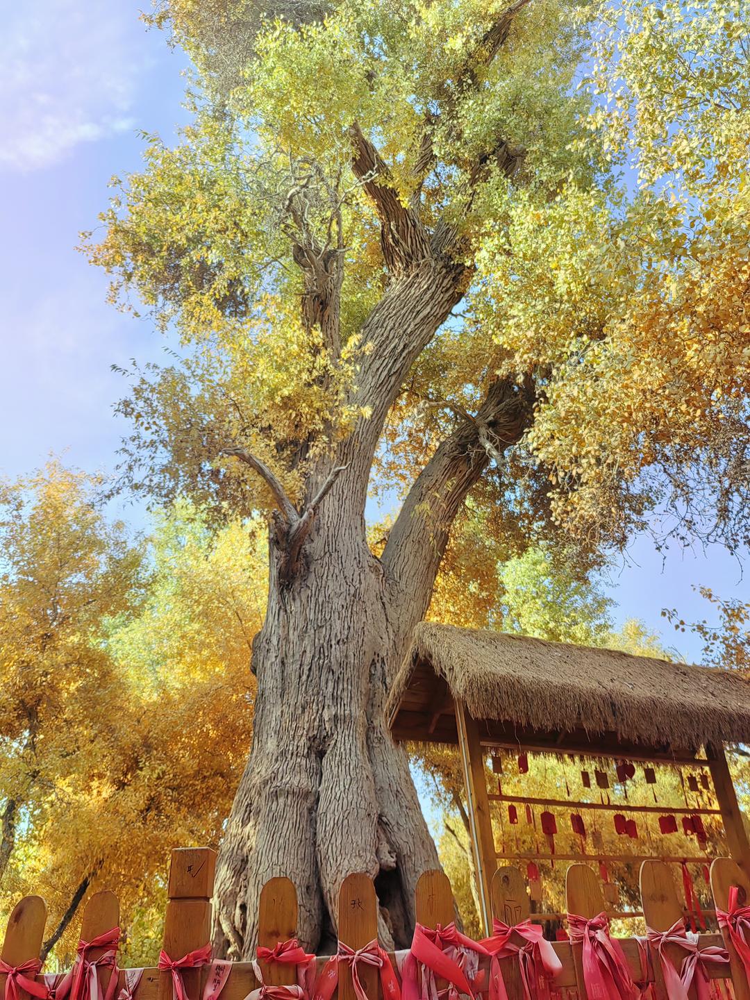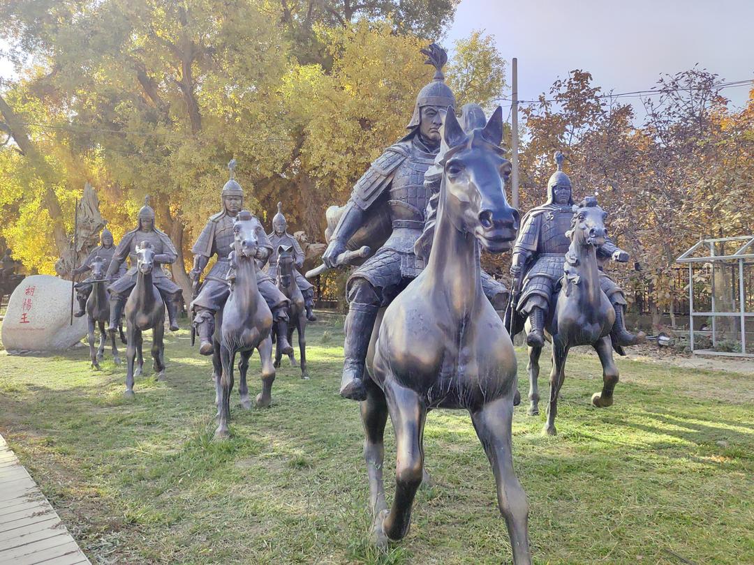 行至胡杨王下,17.5米的身躯直插云霄,7.6米的胸围镌刻着1440年的风霜,这棵摘得基尼斯纪录的“活文物”,皲裂的树皮如老者的手掌,托起层层叠叠的金叶,仿佛在诉说千年的坚韧。身旁金戈铁马的戍边战士雕塑巍然矗立,胡杨的苍劲与战士的豪迈相融,让人遥想古丝绸之路的驼铃与边关的号角,文脉与军魂在此代代相传。