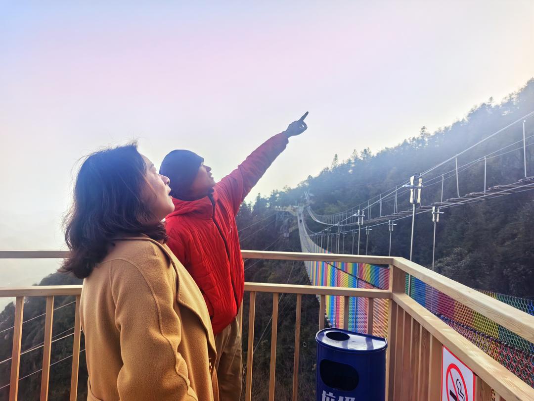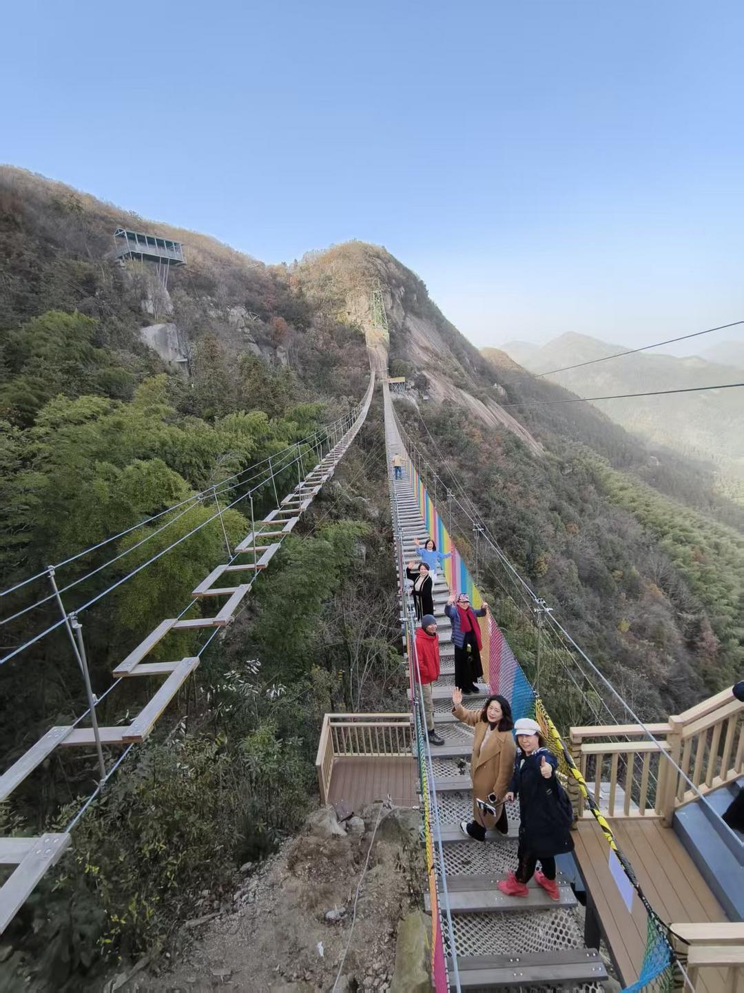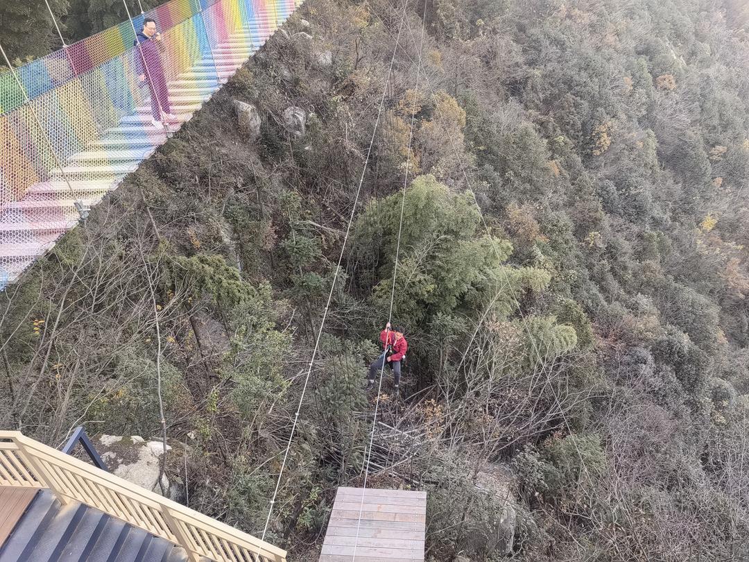 在工作人员的安全指引下,多名勇敢的媒体代表主动体验了彩虹桥项目。踏上桥面的瞬间,轻微的摇晃便带来直观的惊险感,随着脚步前移,桥面晃动幅度逐渐加大,身旁是幽深峡谷,脚下是苍翠林木,耳边传来掠过的风声,既考验平衡感,也挑战心理极限。“刚开始有点紧张,慢慢适应后,反而能静下心来欣赏周围的风景,站在观景平台上远眺,山谷全景一览无余,那种成就感很难得。”一位体验完的媒体代表感慨道。大家纷纷在桥上拍照定格,记录下这场“步步惊心”的挑战瞬间。期间,工作人员沿索道激滑而下的身影,更让大家感受到项目的专业与刺激。