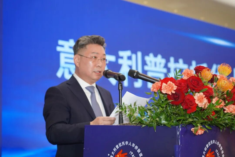 中国驻佛罗伦萨总领馆尹琦总领事代表总领馆讲话。她向浙江省海外联谊会代表团表示欢迎,向大家致以冬至的问候,向陈洲荣任会长和新一届理事会表示祝贺。尹琦总领事肯定了普拉托华人华侨联谊会所取得的成绩:会务蒸蒸日上,在团结侨胞,弘扬中华文化,促进中意友好等方面做了大量工作。她感谢大家群策群力的支持,特别提到背后“夫人们”的大力支持。尹琦总领事提出三点希望:一、就当前普拉托存在的问题,希望大家为建设平安侨社和谐侨社繁荣侨社做出努力,做建设者。希望普拉托华人华侨联谊会作为头部侨团,带领各侨团合作共同努力,在企业经营生产中依法依规,积极履行社会责任,回馈当地社会,共同为侨界的平安和谐繁荣做出努力。二、希望大家做中华文化的传播者,做中意友好的民间使者,讲好中国故事,传播好中国声音。三、在当前变乱交织的国际环境中,希望大家成为中意友好务实合作的推动者,发挥各自优势,赓续中意传统友谊。
