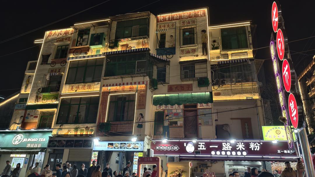 如今的五一路,人气爆棚,节假日更是热闹非凡。2025年中秋、国庆双节期间,街区便吸引近20万市民游客打卡;2025年国庆以来,累计线下打卡人次近30万,元旦假期日均客流更是突破5万人次,春节期间人头攒动、熙熙攘攘,全网曝光量屡破新高。漫步街巷,各类特色小吃琳琅满目,米粉、凉虾、特色卤味香气四溢,小吃摊前挤满了食客,本地市民与各地游客围坐在一起,大快朵颐、谈笑风生,其乐融融的氛围,温暖又治愈。
