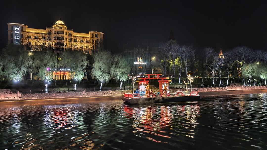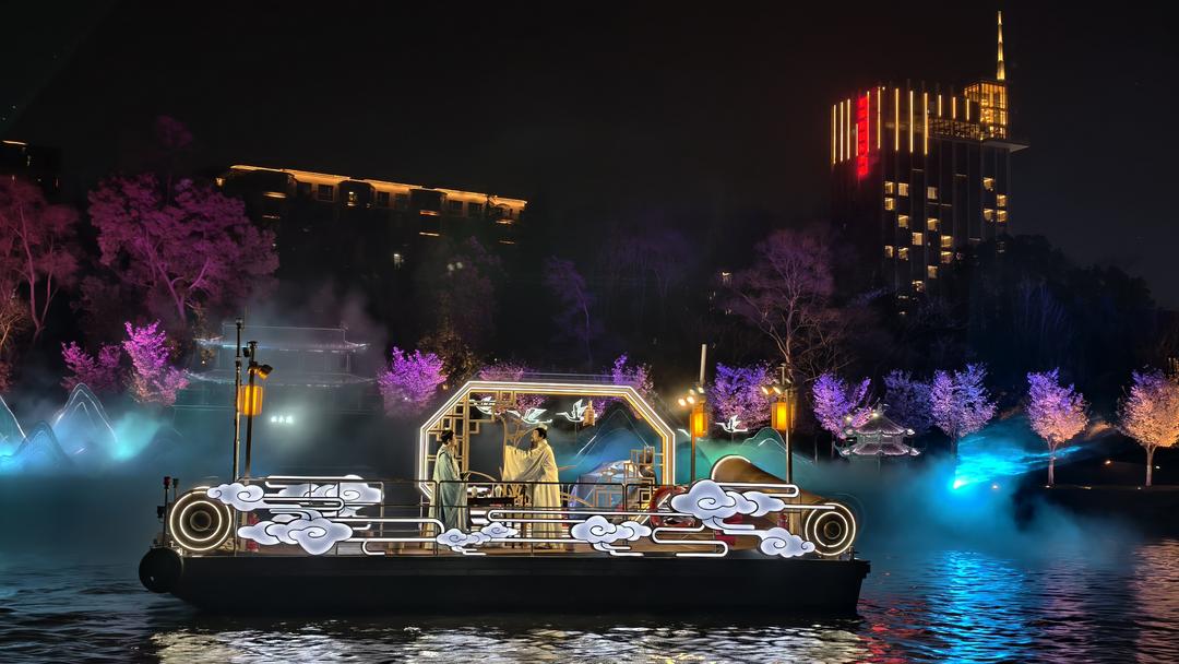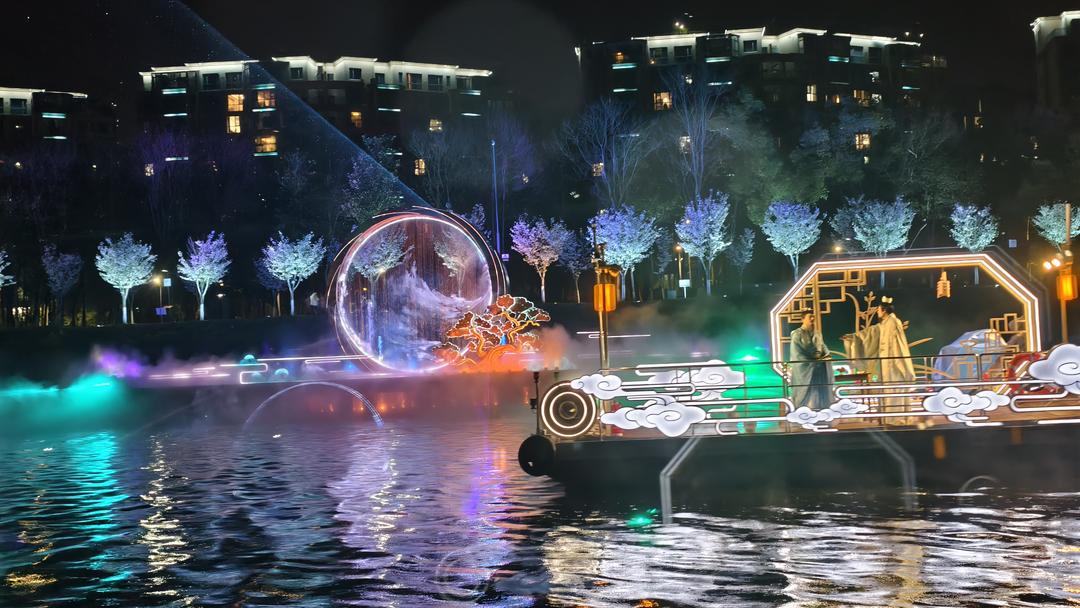 白云湖如一条碧绿绸带,穿城而过。依托得天独厚的滨水生态,沿岸绿廊蜿蜒,栈道临水,平台错落,白日清新雅致,入夜流光溢彩,已然成为集观光休闲、文化体验、夜游演艺、美食休闲于一体的夜间文旅胜地。原本的遗憾,化作夜游的惊喜,众人登船入画,在烟雨朦胧中,赴一场穿越千年的视听之约。