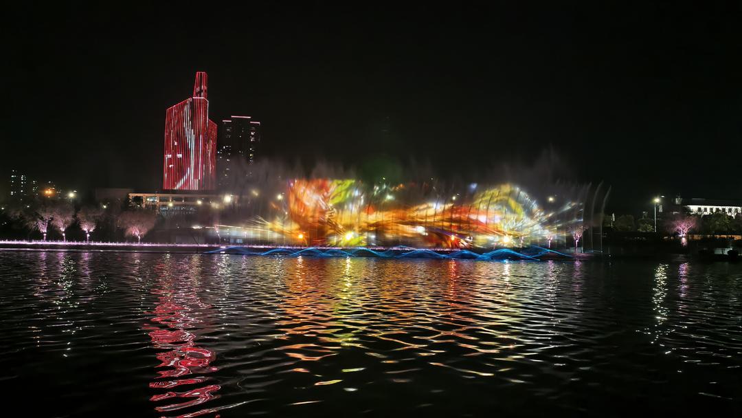 “炎帝长歌”拉开序幕,远古农耕文明的壮阔在水面浮现;“钟鸣天地”间,编钟乐舞穿越时空,青铜之声与水幕光影共鸣,曾随文化的璀璨夺目动人心弦;“隋风宋韵”里,市井烟火与文人风雅交织,历史的温柔扑面而来;“时代随想”中,现代光影与城市新貌交相辉映,诉说随州的蓬勃生机。十余处演艺节点,真人实景与3D水幕、水舞秀、光影船景联动,音乐、舞蹈、戏剧相融,将炎帝文化、编钟文化、红色文化熔于一炉。