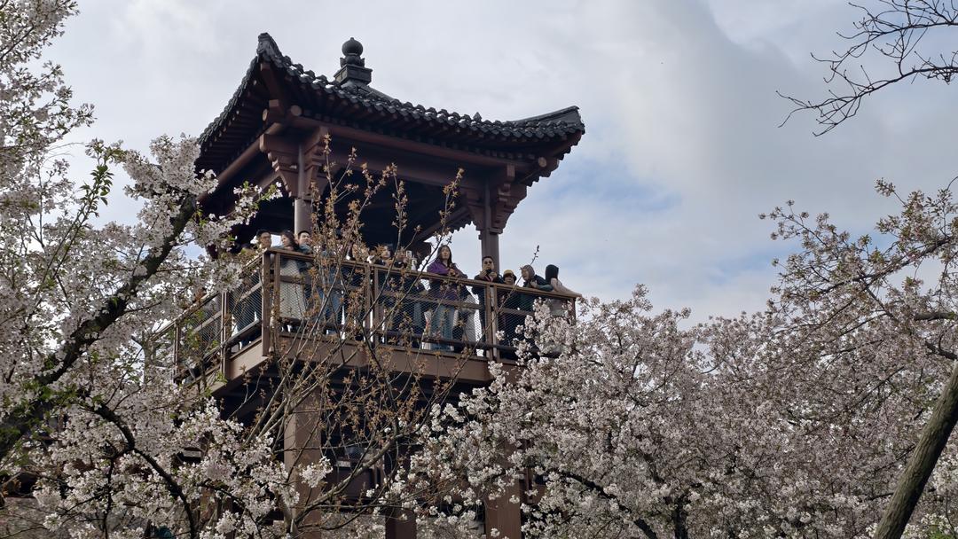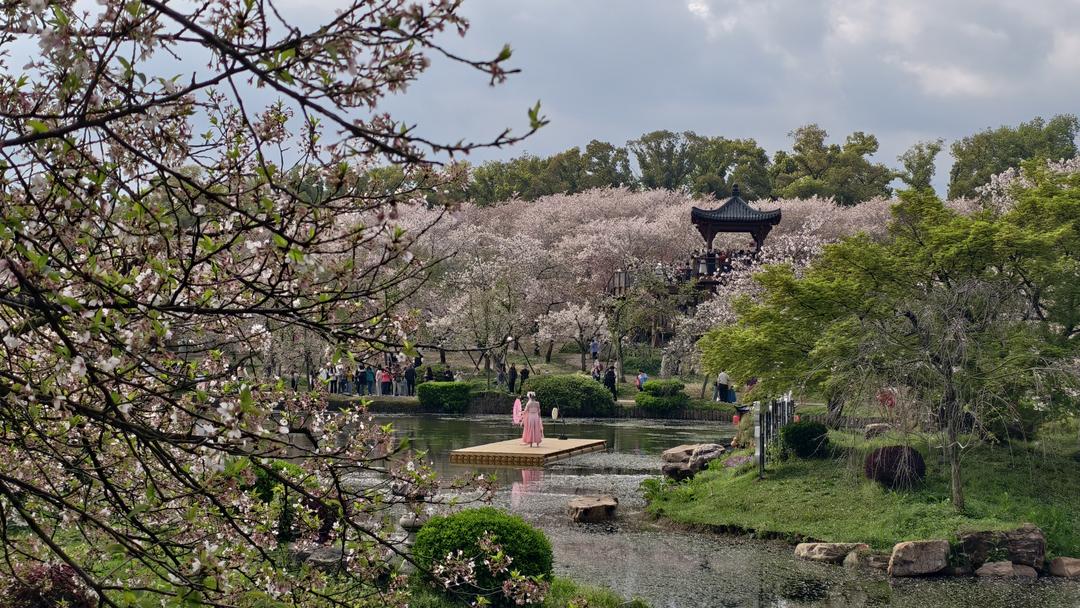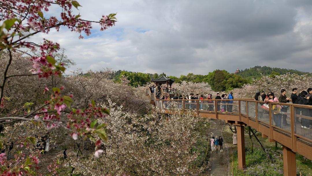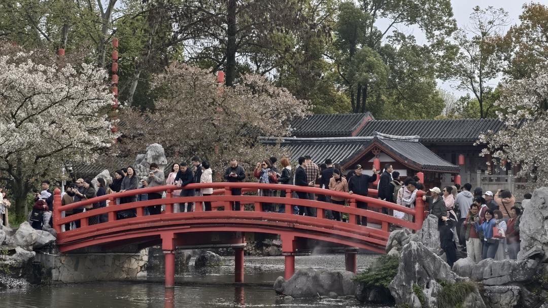 虽已至樱花凋零时节,暖冬催开的繁花并未褪去所有芳华。步入樱花园,游人如织,笑语盈盈,当地居民与四方游客齐聚于此,共赴春日尾声的浪漫。枝头繁花虽不及盛期那般如云似雪,却另有一番诗意。微风轻拂,粉白花瓣随风翩跹,宛若漫天飞雪,悠悠扬扬落在肩头、发间、青石板路上,将整个园区晕染成一幅灵动的水墨春图。