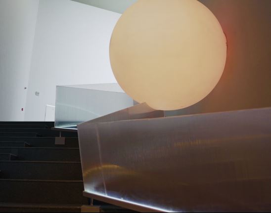 在展览入口处,艺术家通过透光板,灯带等一系列现代工业材料,还原了自然空间中的长河落日,再搭上丽水瓯江边牵来的渔船作为在地文化的象征。观者不仅能感受到经典传统与当代艺术表法方式融合的魅力,也能感受到古堰画乡的历史与山水的互相映照,绵延的人文情怀。