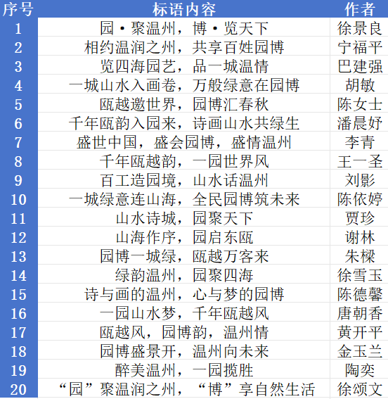 第十五届中国(温州)国际园林博览会社会宣传标语征集活动日前圆满落幕,20条获奖标语正式出炉。