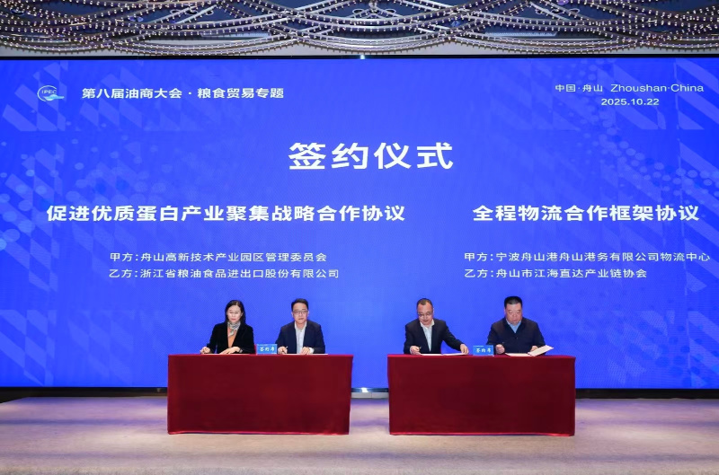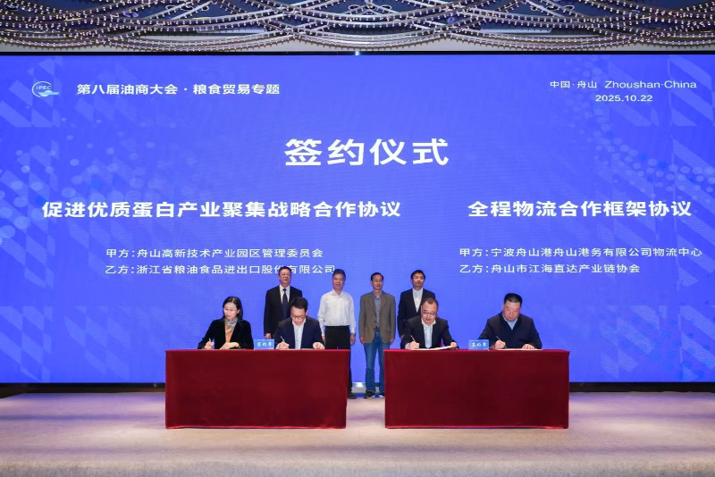 会议现场举行了两场重磅签约仪式,将合作共识转化为切实成果。舟山高新技术产业园区管理委员会和浙江省粮油食品进出口股份有限公司签署促进优质蛋白产业聚集合作协议,双方将整合产业资源、平台经济与政策优势,共同推进粮油及动物蛋白等优质蛋白贸易,加速市场主体集聚。舟港公司物流中心与舟山市江海直达产业链协会签署了全程物流合作框架协议,旨在共同打造高效、经济、安全的江海直达全程物流体系。两项合作协议的签署,将有力推动舟山粮食产业链的协同发展和效率提升。