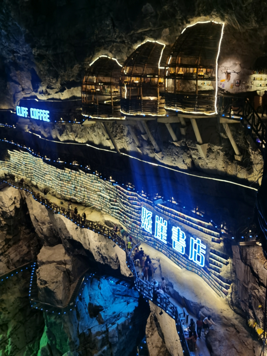 “倒计时,五四三二一”,瞬间,灯全部亮了,整个悬崖一下子变得熠熠生辉,像梦幻中的璀璨世界。哇塞,超燃,悬崖书店亮灯的那一刻,我很庆幸自己赶上了这一美妙时光。
