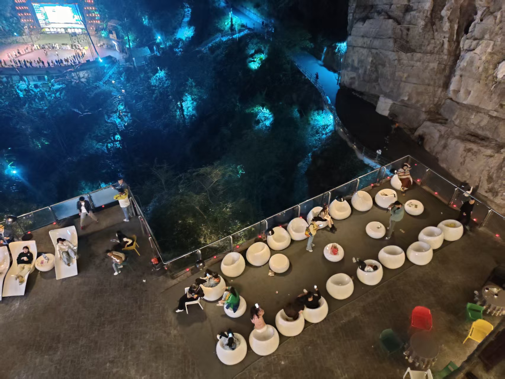 悬崖餐厅前还有一个K歌的平台,很多年轻人从悬崖书店上来又来到这里K歌。大家玩得很尽兴。夜色阑珊,歌声还没有散去。