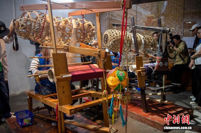 11月16日,来自泰国、柬埔寨、老挝等国家和地区的海外媒体人走进广西来宾市忻城县,体验壮锦技艺。壮锦是中国四大名锦之一,以原色棉、麻线为经,彩色棉线、丝绒为纬,采用“通经通纬”或“通经断纬”的织法,色彩对比强烈,图案丰富绚丽。忻城是广西壮锦起源地之一,在壮族织锦技艺代表性传承人的带动下,当地近年来有近6万人次接受织锦培训;壮锦产品也在不断创新,走进了国际时尚界。图为当地织娘利用古朴的竹笼织机织锦。中新社记者 翟李强 摄