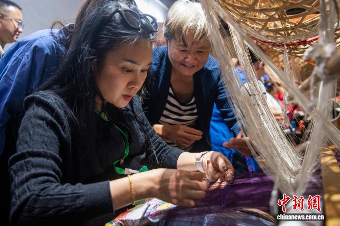 图为来自老挝的媒体人在体验壮锦技艺。中新社记者 翟李强 摄