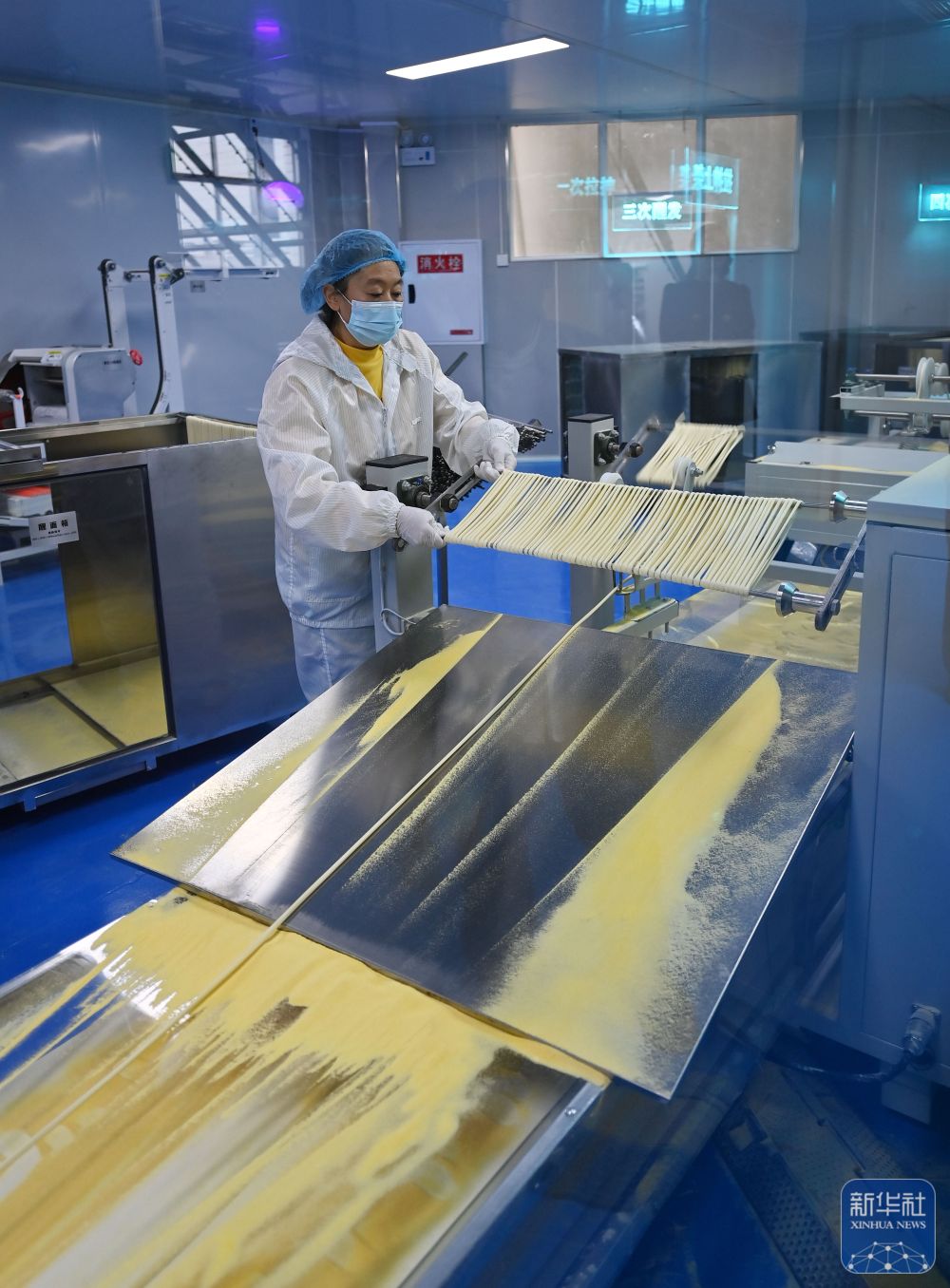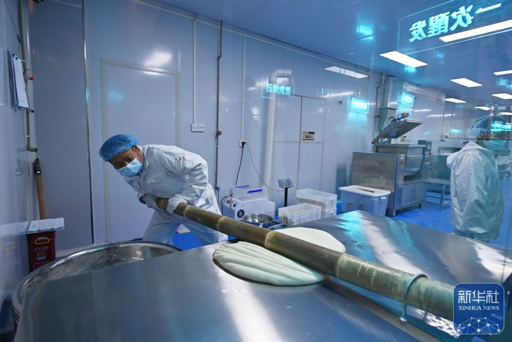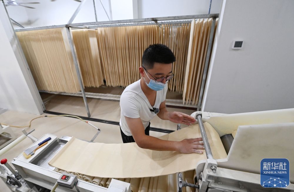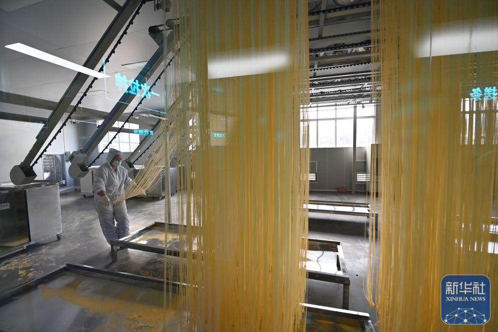 ↑ 11月4日,在巴阳杠子面生产工厂,工作人员将面条“盘条上杆”。巴阳杠子面是重庆市云阳县的传统面食之一,发源于巴阳峡两岸,以竹杠压面工艺和独特口感著称。