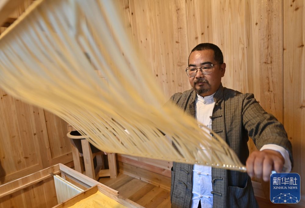 ↑ 11月5日,喜禾麦面业创始人宋喜在重庆市云阳县喜禾麦面业的标准作坊制作面条。1989年出生的宋喜从银行辞职,于2024年开始创业做喜禾麦面业。