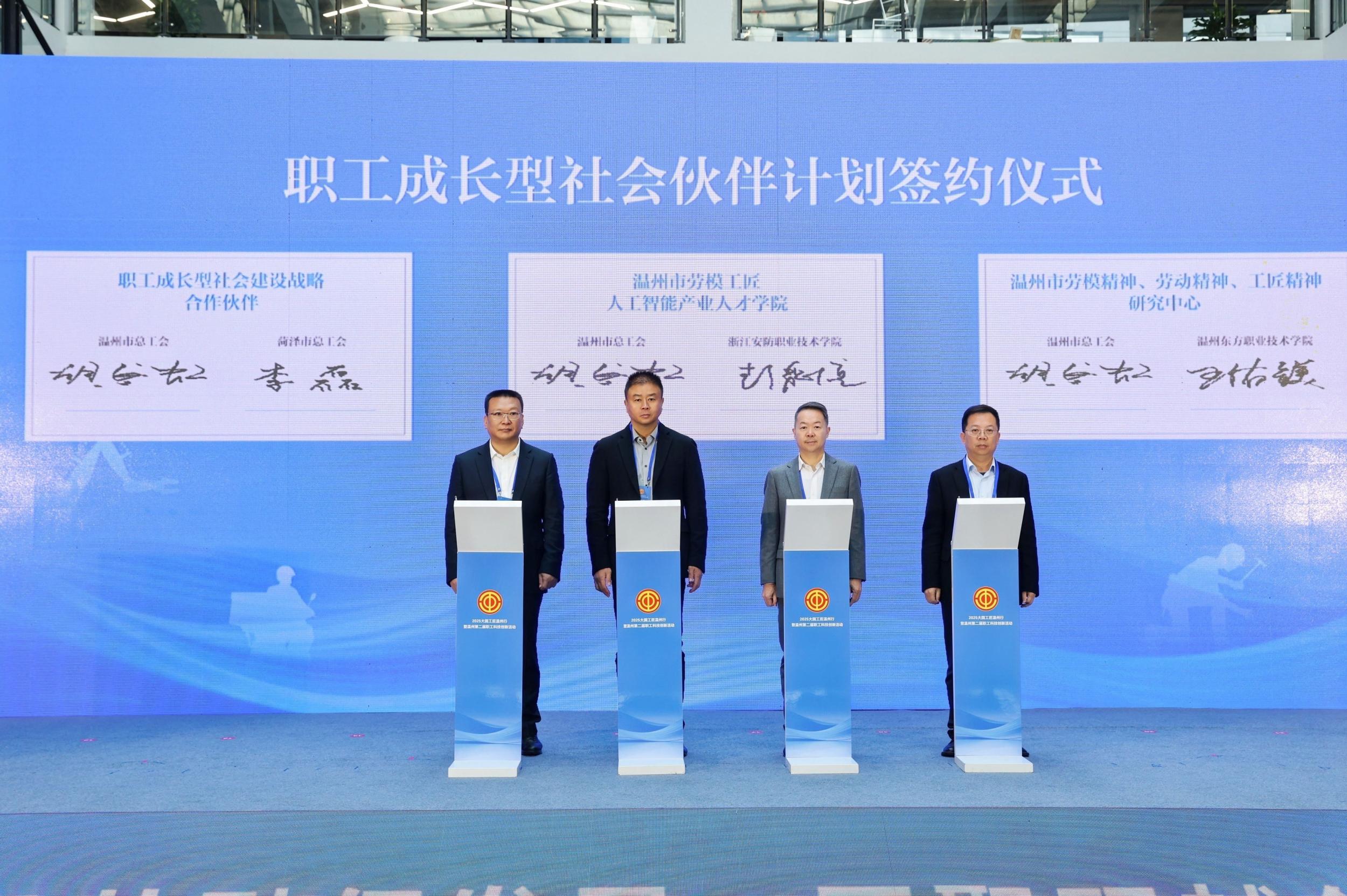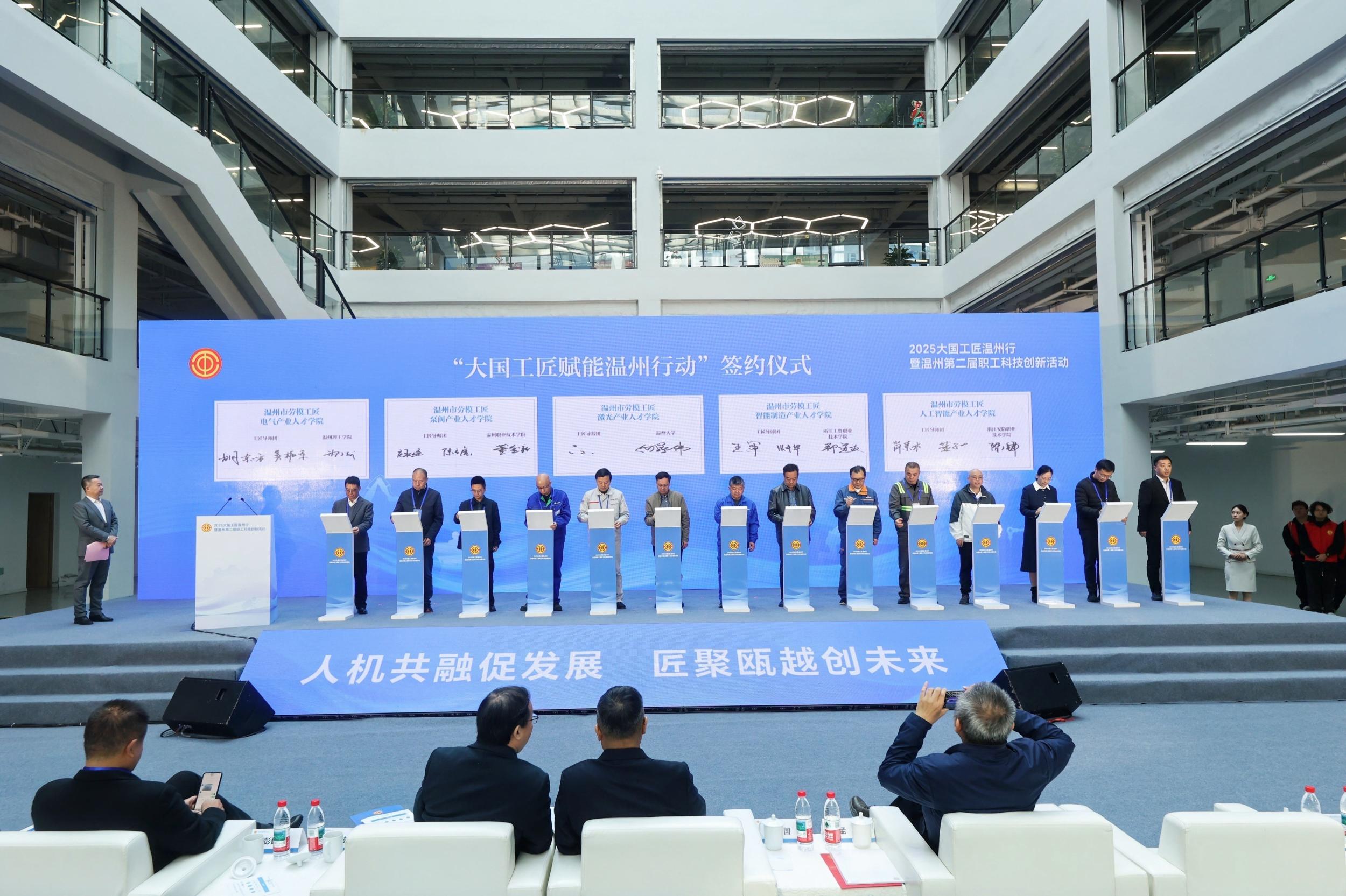 围绕“人机共融促发展,匠聚瓯越创未来”主题,本届活动,温州工会通过搭建创新平台、促成跨界合作、完善激励体系等,系统性介入职工创新全链条。温州市总工会现场“牵手”山东菏泽市总工会,建立战略伙伴关系,开启跨区域协同探索“职工成长型社会”建设。同时联合浙江安防职业技术学院成立“温州市劳模工匠人工智能产业人才学院”,联合温州东方职业技术学院成立“温州市劳模精神、劳动精神、工匠精神研究中心”。