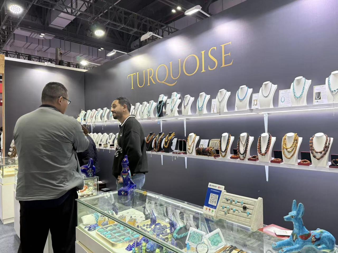 在埃及特色好物馆里,艾哈迈德·瓦利德的展台是开幕首日的人气聚集地之一,这里展示了不少西奈绿松石首饰,一上午忙着接待客人的他,趁着得空坐下来缓了口气——这位受合作方邀请第一次来中国的展商,带来了100多件宝贝,也带来了一个期待:中国这片市场,能挖出怎样的“宝石”?