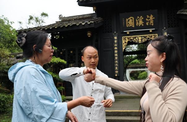 4月13日,来自全球17个国家和地区的20余家海外华文媒体代表走进四川都江堰,参观2000余年历史的水利工程、体验青城武术。图为华文媒体代表学习体验青城武术。中新社记者 张浪 摄