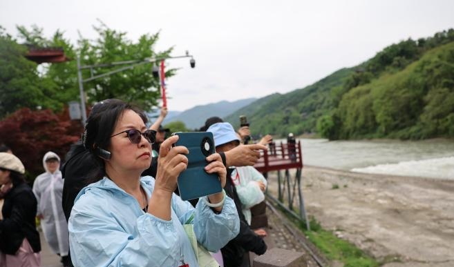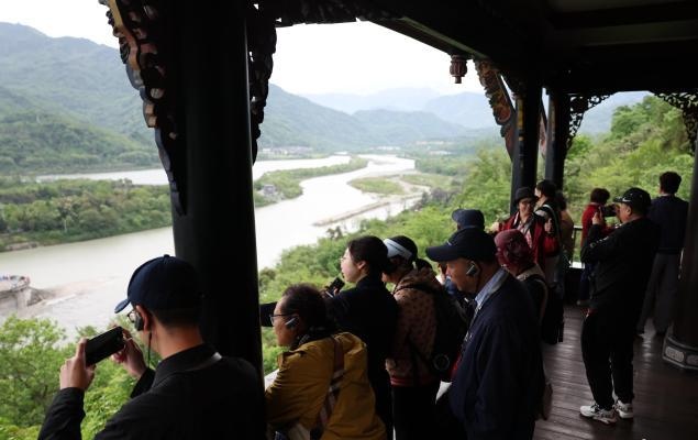 4月13日,来自全球17个国家和地区的20余家海外华文媒体代表走进四川都江堰,参观2000余年历史的水利工程、体验青城武术。图为华文媒体代表参观都江堰水利工程。中新社记者 张浪 摄