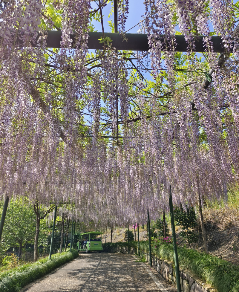 日前,陈龙亲子驾驶电动观光车陪同笔者在莫干花谷游览。穿越在风光绮丽的盘山道路上,紫藤长廊的美景美不胜收,紫藤花特有的淡淡的、带着蜜意的甜香,若有若无地飘在空气里。