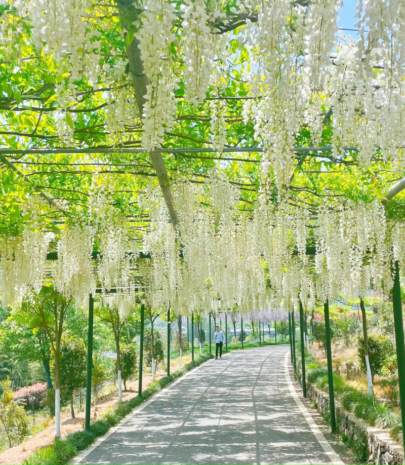 是什么原因让陈龙倾情打造了这条长达1公里、被誉为“华东第一紫藤观光长廊”?他说:“早年结识上海嘉定紫藤园之父汪麟教授后,开始对紫藤进行深入的了解,汪麟教授是世界三大紫藤园缔造者的日本紫藤专家藤本道生先生唯一的中国弟子,他们对紫藤长廊的建设提供了很大帮助,提出了很多专业意见。可以说,有汪麟教授和藤本道生先生最高水准的专业指导才有‘华东第一紫藤观光长廊’,衷心感谢他们的专业精神和友情帮助。“‘华东第一紫藤观光长廊‘共种植了25个紫藤品种,包括安了寺、阿知、熊野等多个日本紫藤品种。紫藤长廊的故事很简单,但却很感人,作为业内人士,汪麟教授和藤本道生先生的专业精神时刻在激励着我,也正因为有这样的故事,我今天才敢说我们要为整个莫干山大景区增色添彩。”