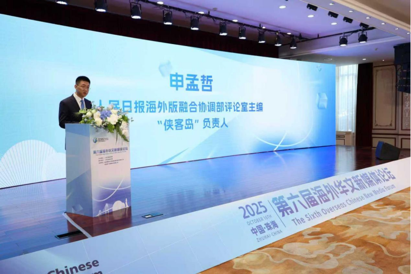 人民日报海外版融合协调部评论室主编、“侠客岛”负责人申孟哲作主题演讲。谢明 摄