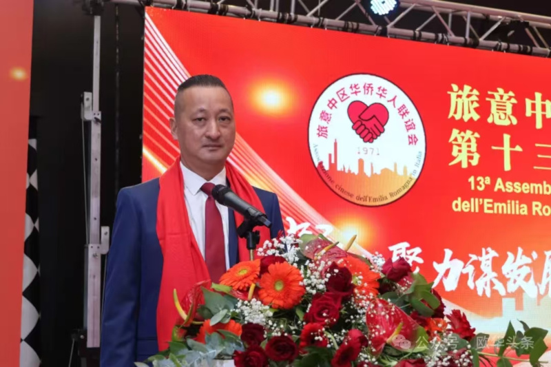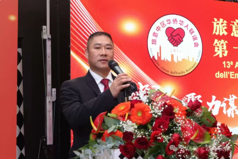 新一任会长蔡焕忠发表就职讲话。蔡焕忠会长代表旅意中区华侨华人联谊会第十三届理事会,向长期以来关心和支持本会的中国驻米兰总领馆、博洛尼亚市政府、各兄弟侨团及社会各界人士表示衷心的感谢,并对莅临现场的嘉宾表示热烈欢迎。蔡焕忠会长回顾了旅意中区华侨华人联谊会的发展历程。他指出,联谊会在历届理事会的不懈努力下不断发展壮大,在服务侨胞、维护侨益、联系当地政府、支持总领馆工作以及配合国内涉侨部门开展慰侨活动等方面,都发挥了重要作用。多年来,联谊会积极为国内政府部门与意大利各机构间的交流合作搭建桥梁,赢得了中国驻米兰总领馆和国内有关部门的充分肯定与赞赏,社会影响力不断提升。对此,他代表第十三届理事会,向历届会长及会长团成员致以最诚挚的谢意。他表示,能够当选为第十三届会长,倍感荣幸,也深感责任重大。他感谢全体理事会成员的信任与支持,并表示新一届理事会将继续秉承“团结、服务、发展”的创会宗旨,进一步加强侨社建设,在服务侨胞、维护侨益、促进中意文化与经贸交流等领域作出更大贡献。他特别提到,本届理事会新增设了妇女委员会和青年委员会,旨在吸纳更多妇女精英和青年才俊加入侨团,发挥妇女的巾帼力量与青年一代的创新优势,积极融入当地社会,传播中华文化,讲好中国故事,进一步凝聚侨心侨力。