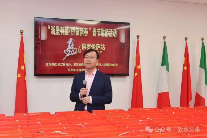 1月28日下午3时,2026年“浙里有爱·侨贺新春”春节慰侨活动佛罗伦萨站启动仪式在意大利佛罗伦萨隆重举行。此次活动在中国驻佛罗伦萨总领馆的指导下,由浙江省侨办、浙江省侨联和意大利佛罗伦萨华人华侨联合总会共同主办,佛罗伦萨领区各侨团联合承办,面向佛罗伦萨领区广大侨胞、留学生代表发放新春暖心包,把来自祖国的关怀与祝福送到海外侨胞身边。