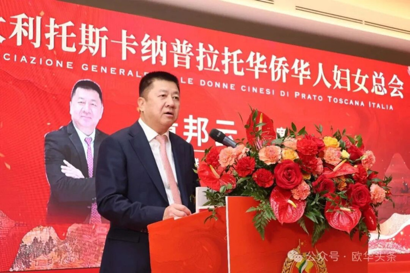 温州市侨联副主席董邦云致辞。董邦云表示,受温州市侨联党组书记吴娜丽、主席南品仁的委托,向普拉托妇女总会的成立表示热烈祝贺,她表示,普拉托妇女总会的成立,是海外侨界女性力量不断壮大的生动体现,也是新时代侨社组织蓬勃发展的重要标志。广大旅意侨胞始终心系桑梓、情牵家乡,无论身在何处,都以实际行动支持家乡建设、讲好温州故事。他希望普拉托妇女总会今后进一步发挥桥梁纽带作用,凝聚巾帼力量,加强与温州市的互动交流,在推动经贸往来、文化互鉴、公益慈善和青年培养等方面展现更大作为。同时也期待妇女总会团结更多优秀女性,提升组织影响力与社会参与度,在促进中意民间友好、弘扬中华优秀传统文化方面发挥独特而持久的作用。董邦云副主席致辞最后表示,温州市侨联将一如既往关心和支持海外侨团发展,愿与大家携手同心,共同书写新时代侨界合作共赢的新篇章。