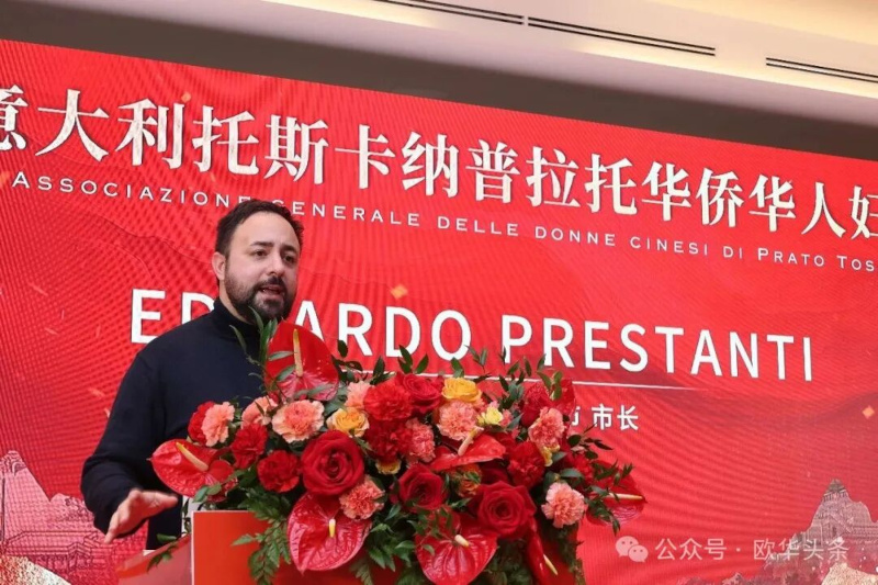 Carmignano市市长Edoardo Prestanti致辞。他表示很高兴参与此次庆典,虽然Carmignano是一座规模不大的城市,但这里生活着不少中国朋友,大家为当地社会注入了活力。看到普拉托妇女总会的诞生,他感到十分欣慰,并期待女性力量能够携手成长、共同进步。他还热情介绍,Carmignano拥有优质的葡萄酒与橄榄油,诚挚欢迎大家前往参观交流,增进中意文化对话。当地也开设有太极课程,希望更多华人朋友积极融入,共建多元和谐的社区。