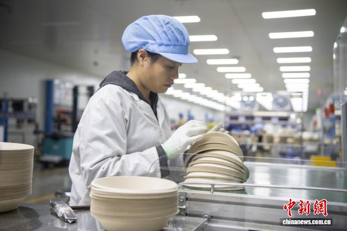 图为广西绿联生物科技有限公司的工人在生产环保餐具。林馨 摄
