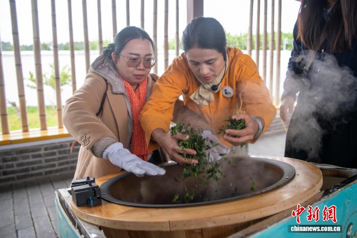 11月18日,来自泰国、柬埔寨、老挝等国家和地区的媒体人,在广西来宾市象州县学习古琶茶制作、茶礼等,体验中国茶文化。象州种茶历史悠久,是唐代陆羽所著《茶经》中记载的岭南主产茶区。图为广西壮族自治区非物质文化遗产代表性项目古琶茶制作技艺代表性传承人冯康玲演示炒茶。中新社记者 翟李强 摄