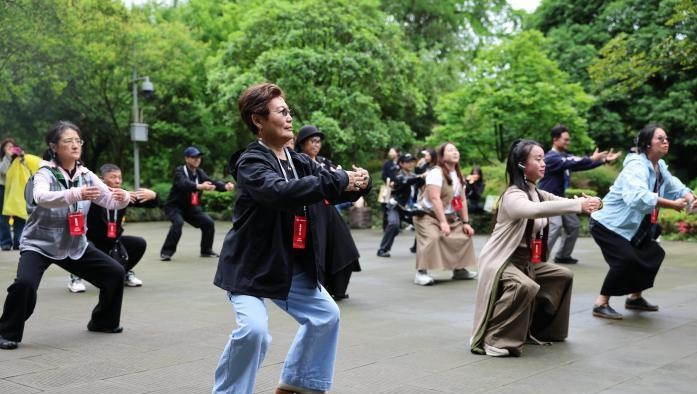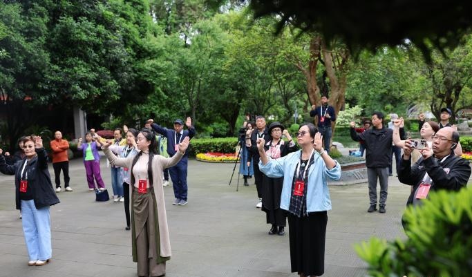 4月13日,来自全球17个国家和地区的20余家海外华文媒体代表走进四川都江堰,参观2000余年历史的水利工程、体验青城武术。图为华文媒体代表学习体验青城武术。中新社记者 张浪 摄
