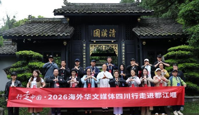 4月13日,来自全球17个国家和地区的20余家海外华文媒体代表走进四川都江堰,参观2000余年历史的水利工程、体验青城武术。图为华文媒体代表学习体验青城武术后合影。中新社记者 张浪 摄
