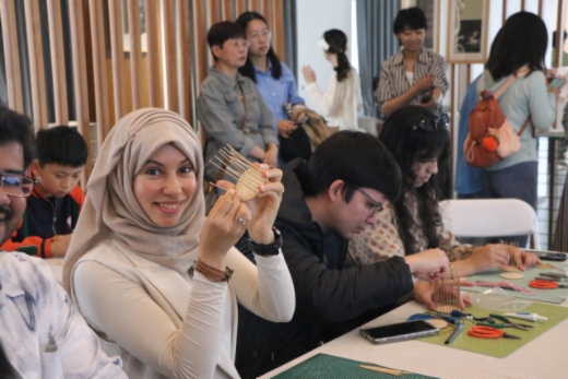 展厅内,细腻精美的螺钿镶嵌、灵动雅致的竹编摆件、流光溢彩的银花丝饰品、易拉罐变废为宝的工艺作品错落陈列。每一件藏品都凝聚着民间匠人的心血,承载着郫都千年文脉。雁鸿边走边讲,重点介绍了以杜鹃、龙舟、堰桥等郫都元素创作的作品,让留学生们在欣赏工艺之美的同时,更加了解这座城市的文化符号。