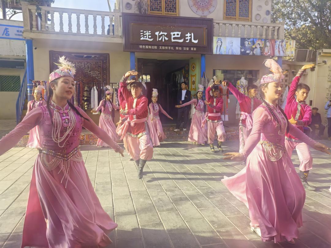 刚走进小巷,一阵欢快的舞者便吸引了媒体代表们的目光。身着鲜艳民族服饰的小伙与“古丽”跳起热情奔放的麦西来甫,旋转的裙摆、灵动的舞步,将当地群众的爽朗与豪迈展现得淋漓尽致。代表们纷纷举起相机,记录下这美好的瞬间。