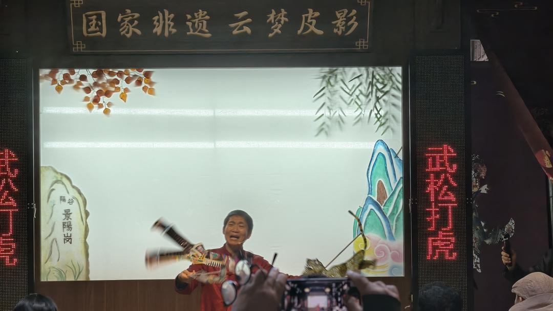 原皮影戏戏台大多散落乡野,茶社戏馆皆是舞台,现国家级传承人秦礼刚把戏台班搬入景区。他执竿弄影,指尖轻捻,人物便活灵活现;开口一唱,古韵悠长。那幕布上的武松打虎,身姿矫健,气势凛然,一招一式尽显匠心,一唱一念皆是传承。