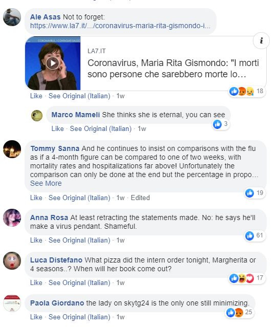 目前,有意大利网民发现吉斯蒙多已经“隐藏”了自己社交账号上之前关于新冠肺炎疫情的言论乃至所有2020年她发过的贴文。一些意大利网民便因此将不满发泄在了她一个2018年的贴文下面,质问和攻击她对疫情的误判,并要求她从医院辞职。