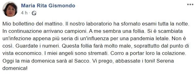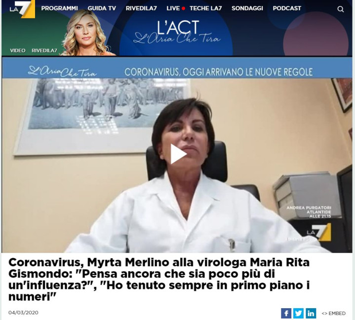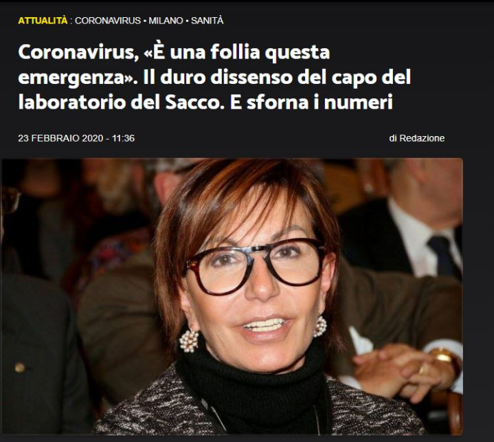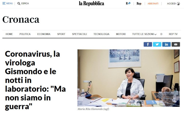 她叫玛莉亚·瑞塔·吉斯蒙多(Maria Rita Gismondo),是意大利米兰萨科医院(Sacco Hospital)临床生物学、病毒学和应急生物诊断学实验室(the Laboratory of clinical microbiology, virology and bio-emergency diagnostics)的主任。
