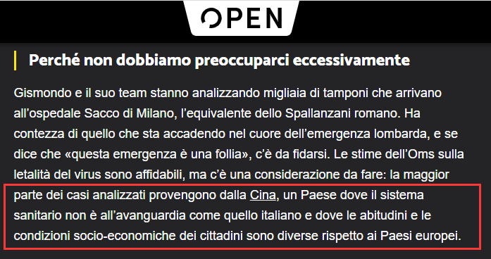 一个典型的例子是,就在吉斯蒙多在2月24日表示无需对意大利的疫情紧张担忧之后,当时就有意大利媒体称她说的是对的,因为“中国的卫生系统没有意大利先进,(中国)民众的生活习惯和社会经济条件也不同于欧洲国家”。