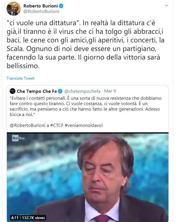 最后,伴随着吉斯蒙多“人设崩塌”而重新被人们看重的布里奥尼,在他新发的一段关于疫情防控的贴文中表示,面对新冠病毒这么一个“暴君”,人们不仅需要付出和牺牲,还需要一些“专制”,因为只有全社会每个人都团结起来,做好自己的工作,才能战胜病毒。