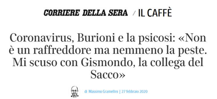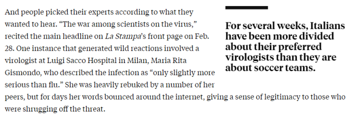 这篇文章还同时提到了吉斯蒙多的事情,称吉斯蒙多那种认为疫情“只比感冒强一点”的言论之所以会在意大利有市场,是因为不同的人只想听到自己想听的内容,所以也会选择不同的专家去支持——甚至这种情况比不同的球迷在谈论各自的球队时还要“分裂”。