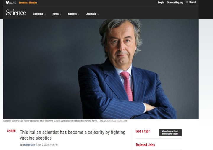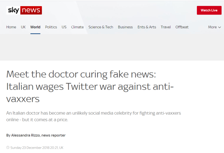 英国天空电视台2018年的一篇报道就提到了此事,并介绍说这位意大利病毒学家,因为常年在媒体和网络上力推政府强制儿童注射疫苗的政策,并经常批判那些拒绝给孩子打疫苗的人,早就已经被他的“敌人”多次扣上“法西斯”的大帽子了,甚至还有人说他是“撒旦的信徒”。