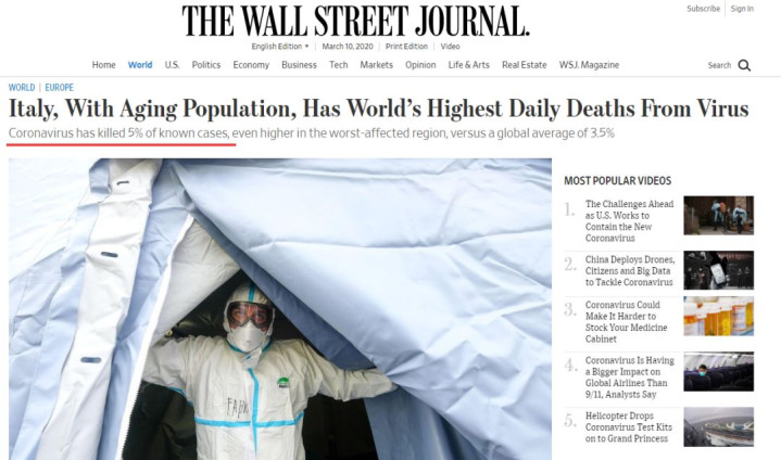 截至今天,意大利的确诊人数已经逼近了1万人,死亡人数也在逼近500人,这样算下来意大利新冠肺炎死亡率就已经逼近5%左右了。就连美国《华尔街日报》都感叹说意大利的死亡率现在比全球平均的3.5%的死亡率都要高出了不少。