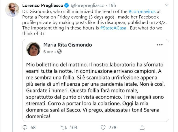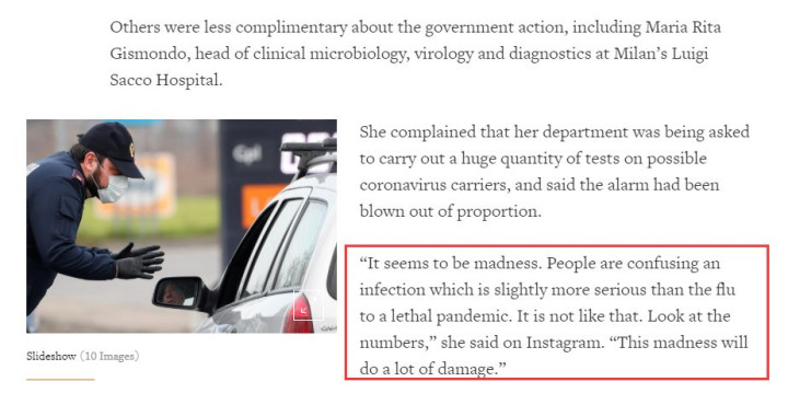 一位名叫罗伯托·布里奥尼(Roberto Burioni)的病毒学家就表示,虽然不该炒作对疫情的恐慌情绪,但吉斯蒙多使用的数据有问题,而实际的数字显示新冠肺炎比流感严重,因为意大利2月23日确诊的132人中,重症人数有26人,重症比率多达20%。他还呼吁意大利应该采取更严格的措施防控疫情。