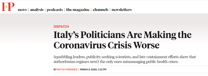 讽刺的是,引用了这个说法的美国《外交政策》杂志,却明显对于意大利的表现很“懊恼”,认为意大利“失序的政治系统”和“短视的政客们”正在丢“民主”国家的脸。