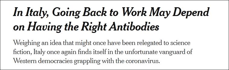 报道指出,继率先爆发疫情后,意大利这次以抗体为基础的复工讨论,又不幸地再次为西方民主国家“打头阵”。