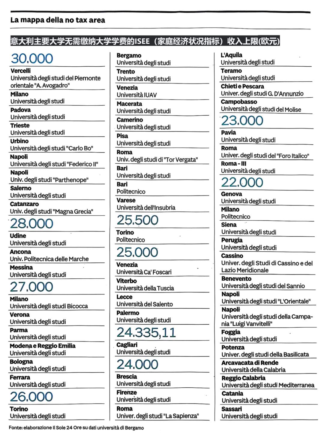“No Tax Area”政策的诞生旨在帮助年轻人,尤其是经济条件较差的学生。该政策作为2016年《财政法案》的一部分,自2017-2018学年起实施,规定符合ISEE标准的学生可减免注册费。起初政策范围较窄(ISEE 低于1.3万欧元可全免,1.3–3万欧元之间可享受一定优惠),后因疫情而扩展,目前这一标准上限已提高到2.2万欧元。不仅如此,许多大学还决定在教育部设定的标准之上进一步提高减免门槛:2024-2025学年,全国59所高校中有45所设定了高于2.2万欧元的减免上限,其中9所甚至将上限设定至2.3-3万欧元。
