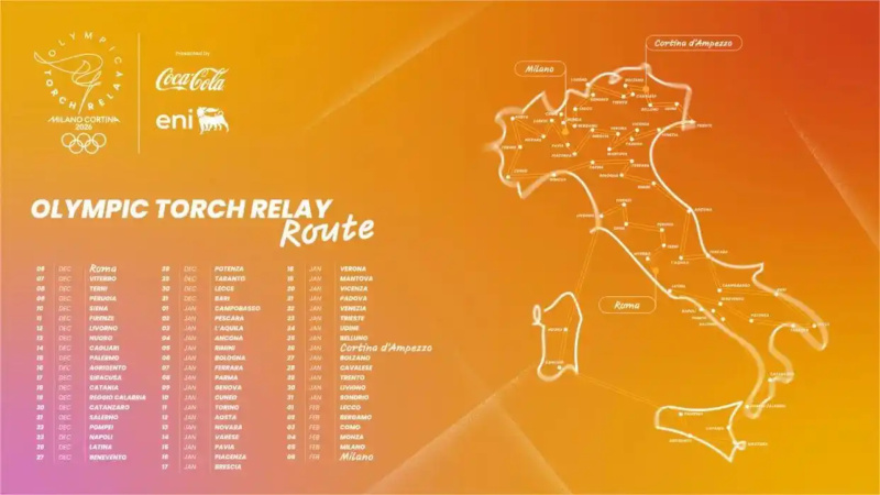 据央视新闻消息,当地时间11月17日,2026米兰-科尔蒂纳丹佩佐冬奥会组委会正式公布了奥运火炬传递的完整路线。根据安排,圣火将在2025年12月6日至2026年2月6日的两个月时间里,沿着一条总长约12000公里的路线,穿越意大利全部20个大区、110个省份,并途经多处世界文化遗产与地标性景观。
