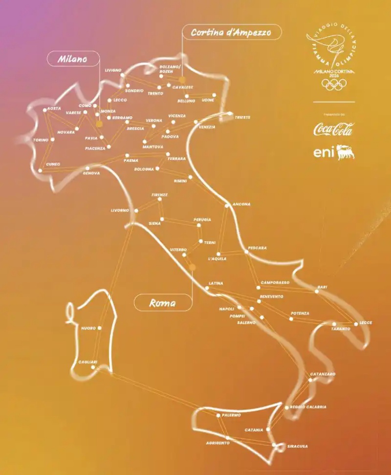 米兰冬奥会火炬在意大利境内的传递路线图。图源:米兰冬奥组委12月6日上午,2026年米兰-科尔蒂纳冬奥会火炬从意大利首都罗马的马尔米体育场出发,开始为期63天、穿越意大利全境的传递。