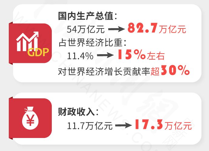 1、五年来,经济实力跃上新台阶。国内生产总值从54万亿元增加到82.7万亿元,年均增长7.1%,占世界经济比重从11.4%提高到15%左右,对世界经济增长贡献率超过30%。